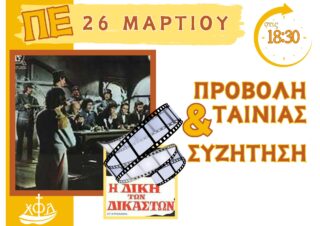 ΑνακοινώσειςΑθήνα Παρακολουθώντας Ιστορία! Από φοιτήτριες - Αθήνα - 23 Μαρτίου 2026 0 246 Εκτύπωση (καμία αξιολόγηση προς το παρόν) Loading... Την Πέμπτη 26 Μαρτίου, στο εντευκτήριό μας, συζητάμε παίρνοντας αφορμή από την επίκαιρη ιστορική ταινία “Η δίκη των δικαστών”. Ώρα έναρξης προβολής ταινίας: 18:30. Σε περιμένουμε!
