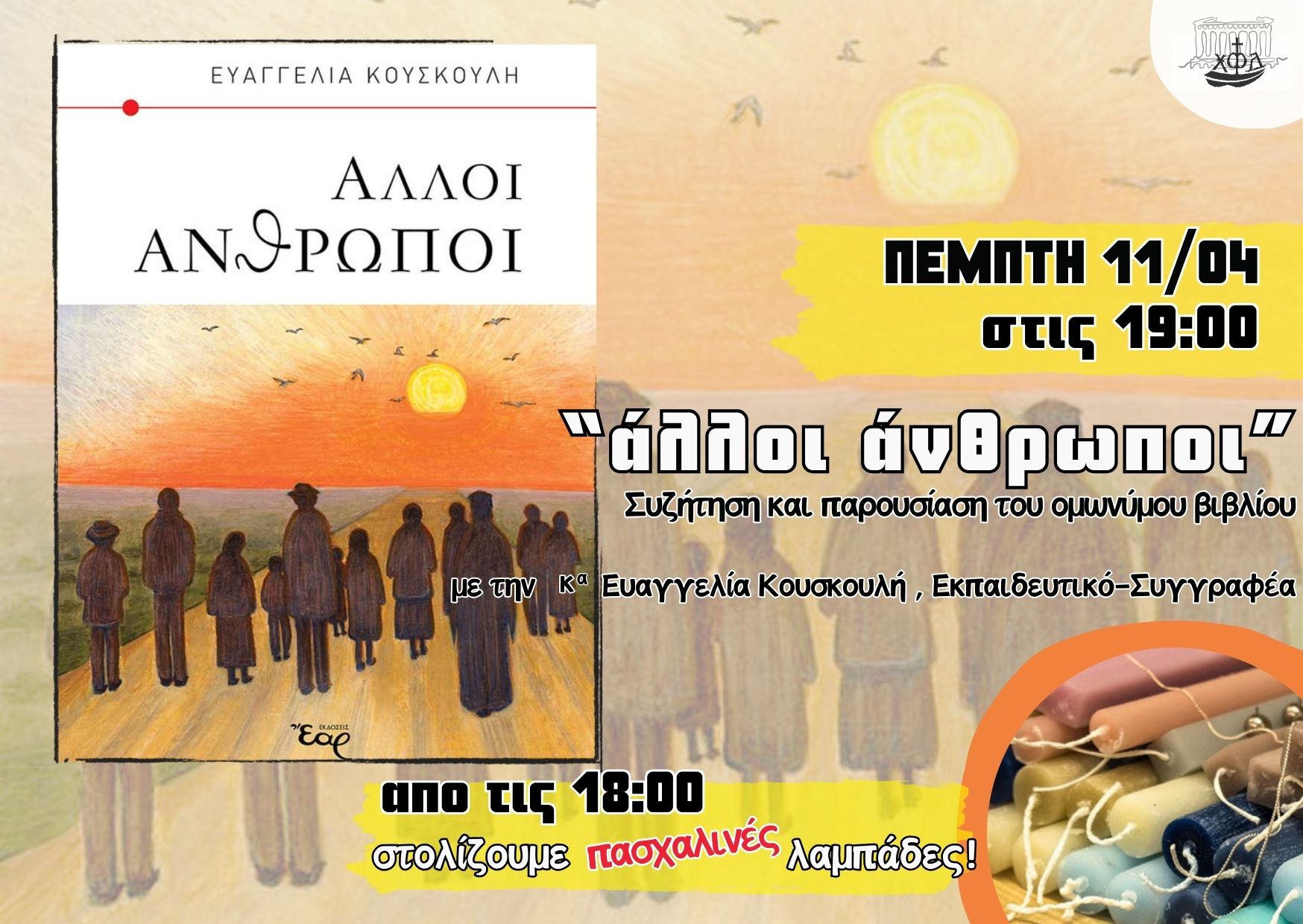 Ώρα 18:00  καλλιτεχνικό εργαστήρι Πασχαλινής λαμπάδας.