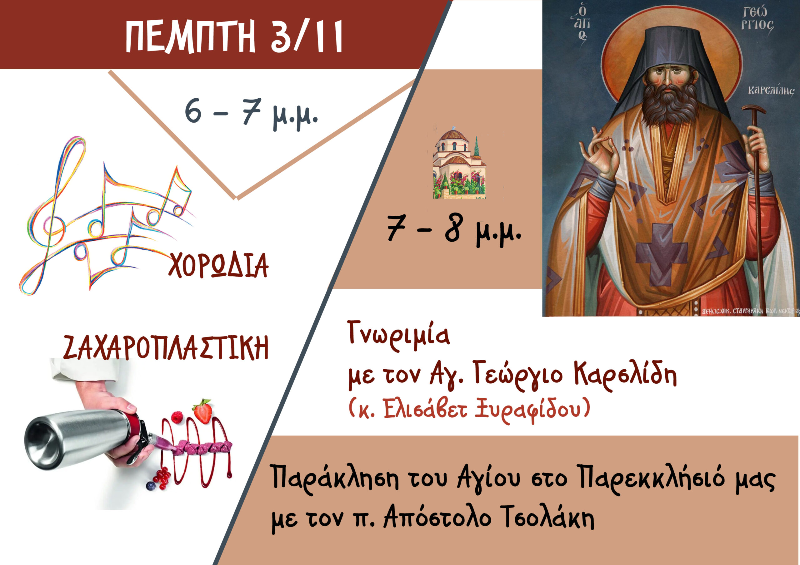 7 – 8 μ.μ.: Γνωρίζουμε τον Άγιο Γεώργιο Καρσλίδη και ψάλλουμε την Ιερά Παράκλησή του. Την Παράκληση θα τελέσει ο π. Απόστολος Τσολάκης στο Παρεκκλήσιο του Μ. Βασιλείου.