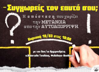 Την Κυριακή 31 Μαρτίου και ώρα 8.30 στο εντευκτήριο οδός Σβώλου 42, θα ομιλήσει ο πατήρ Απόστολος Τσολάκης, θεολόγος και φιλόλογος, με θέμα "Λίγα...