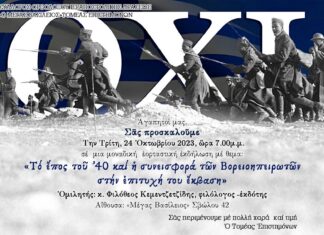 Σας προσκαλούμε την Τρίτη 24 Οκτωβρίου, ώρα 7.00 μ.μ. σε μια εορταστική εκδήλωση με θέμα «Το έπος του ‘40 και η συνεισφορά των Βορειοηπειρωτών στην επιτυχή του έκβαση», με ομιλητή τον κ.Φιλόθεο Κειμεντζετζίδη, στην Αλ.Σβώλου 42.