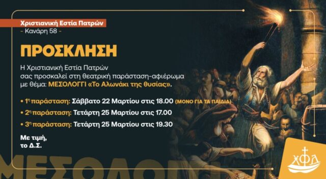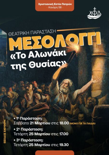 Τα νέα μαςΠάτρα ΜΕΣΟΛΟΓΓΙ – Το Αλωνάκι της Θυσίας (Θεατρική Παράσταση) Από φοιτήτριες - Πάτρα - 23 Μαρτίου 2026 0 386 Εκτύπωση (καμία αξιολόγηση προς το παρόν) Loading... Παρακάτω μπορείτε να παρακολουθήσετε τα τραγούδια της γιορτής.